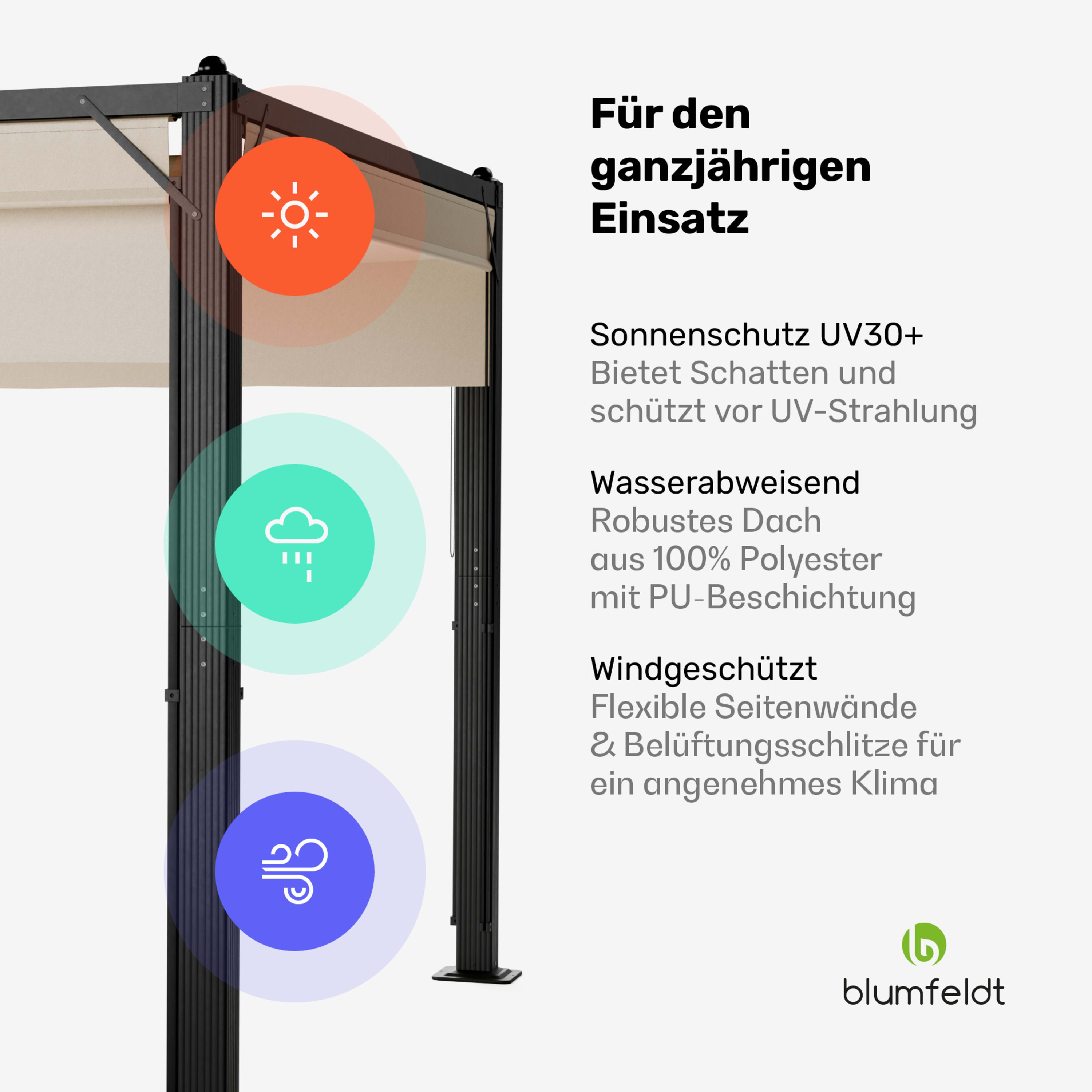 Mit dem stufenlos raffbaren Stoffdach aus 200 g/m² Polyester und einem UV-Schutz von 30+ erhält man die volle Kontrolle über Schatten und Sonne. Der Seilzug lässt das Sonnendach des Pavillons in seinen Führungsschienen geschmeidig vor- und zurückgleiten, die wasserabweisende Beschichtung schützt vor Schimmel und kurzen Regenschauern. Durch die flexibel auf- und abrollbaren Seitenteile aus 180 g/m² Polyester-Stoff bleibt man die ganze Zeit windgeschützt.