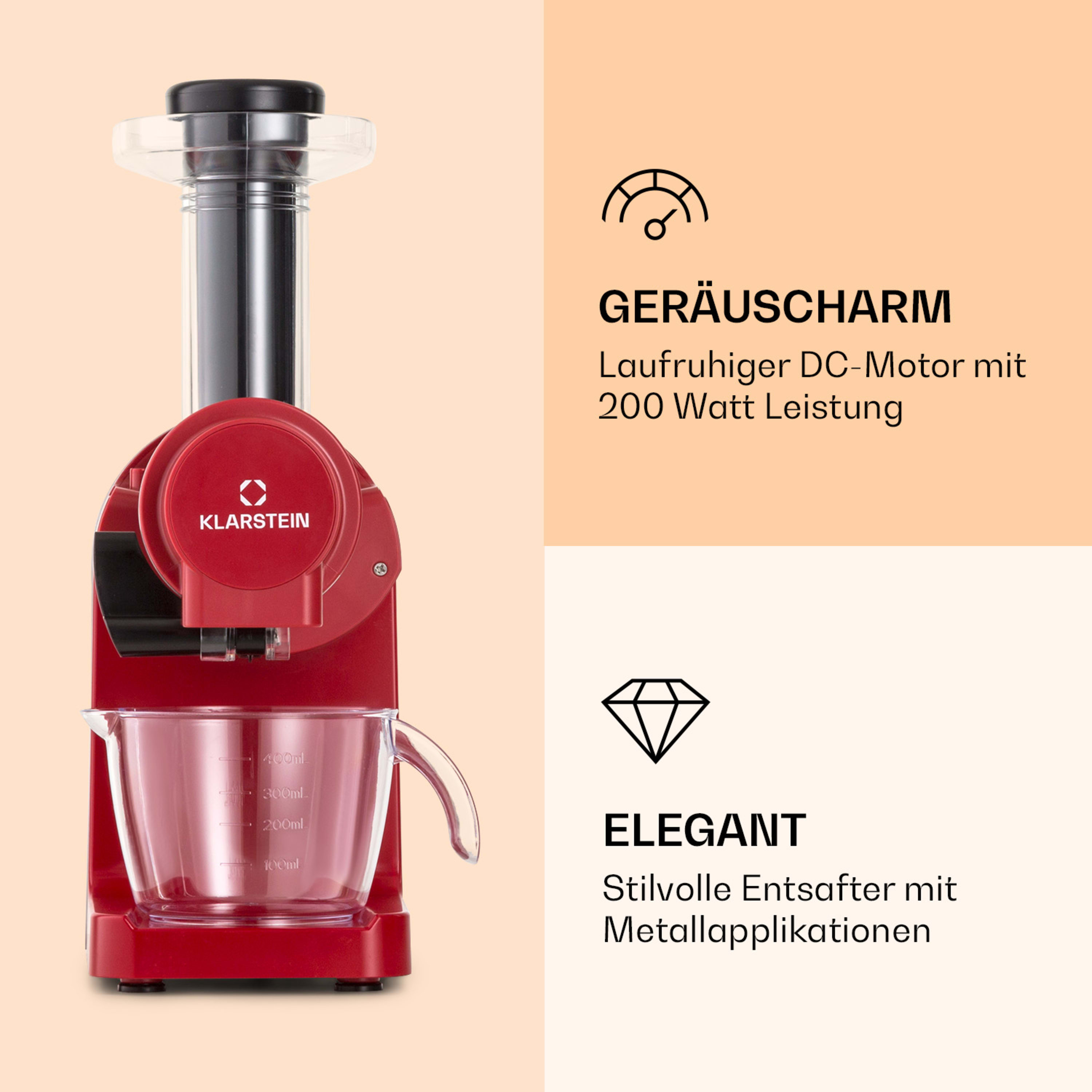 Elegant, gesund und praktisch: Die Klarstein Bella Elegance Saftpresse macht es dir ganz einfach, dich und deine Familie mit leckeren, selbstgepressten und vitaminreichen Säften zu versorgen. Mit 200 Watt Leistung holt die Schneckenpresse die ganze Kraft aus den Früchten. Ob Orangen, Äpfel, Beeren, Gurken oder Möhren: Unermüdlich und ohne Hitzeeinsatz füllt sich der 400 ml Saftbehälter, während Fruchtreste zum Weiterverwenden oder Entsorgen in einem eigenen Auffangbehälter landen. Und ganz wie der Name sagt, sind die Klarstein Bella Elegance Entsafter echte Hingucker in deiner Küche. Damit sind sie auch nach dem Einsatz die Stars auf der Anrichte!