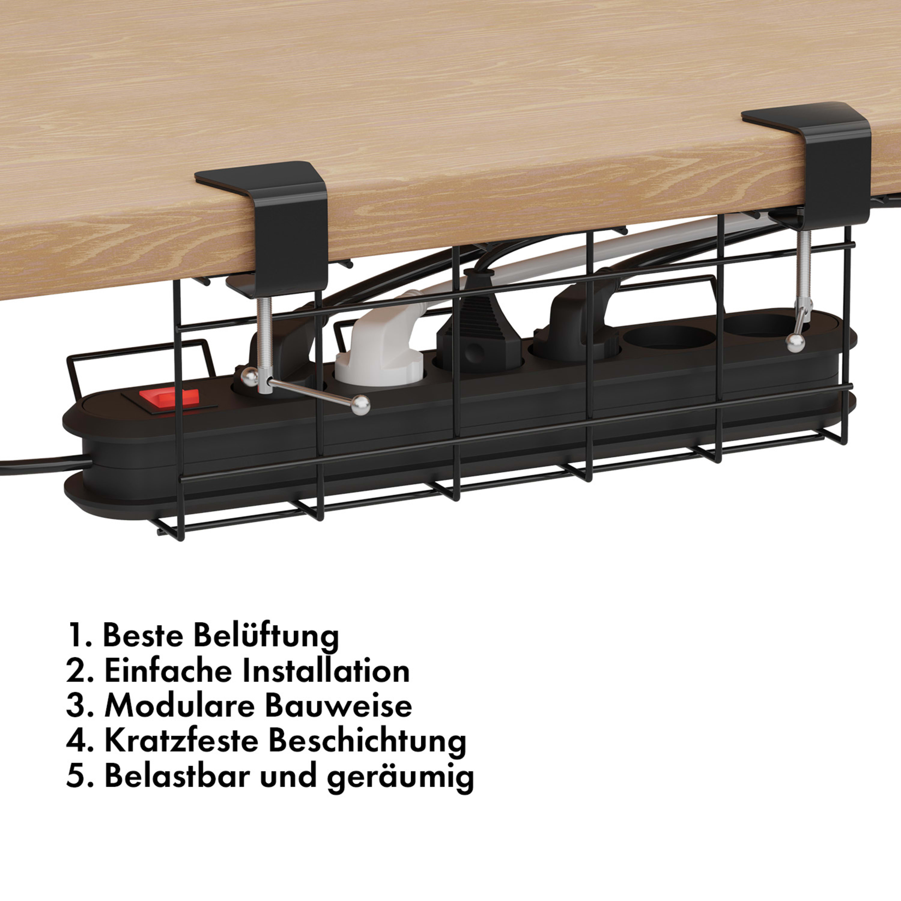 Ich hatte immer Probleme mit baumelnden oder auf dem Boden liegenden Kabeln. Diese Lösung ist definitiv die beste, die Sie finden können! Es ist vielseitig einsetzbar, passt sich sehr gut an jede gewünschte Aufstellung an und ist geräumig. Darüber hinaus sind sie mit 2 ausgestattet, so dass der Platz auch für große Schreibtische absolut ausreichend ist. Beraten!