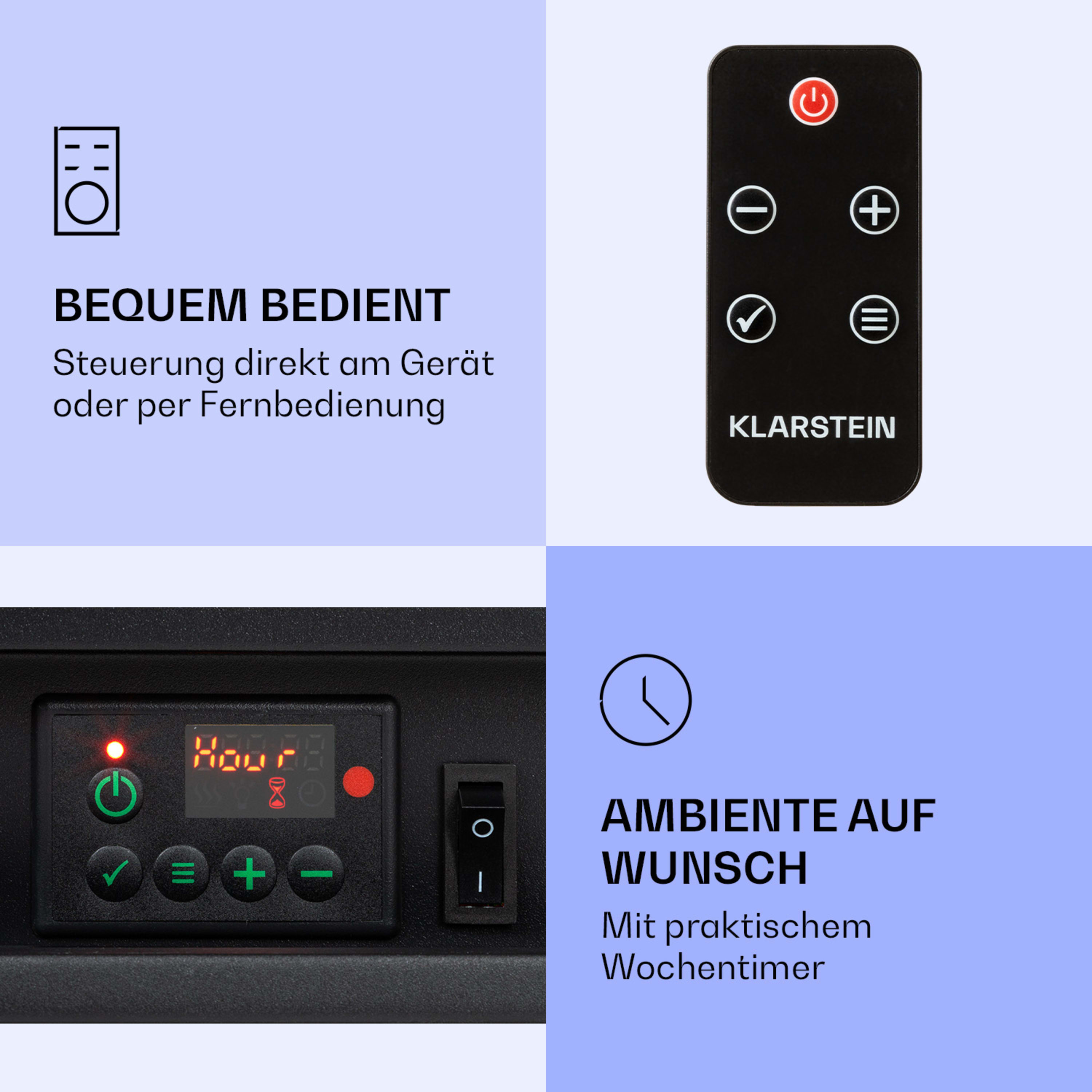 - Steuerung direkt am Gerät oder per Fernbedienung