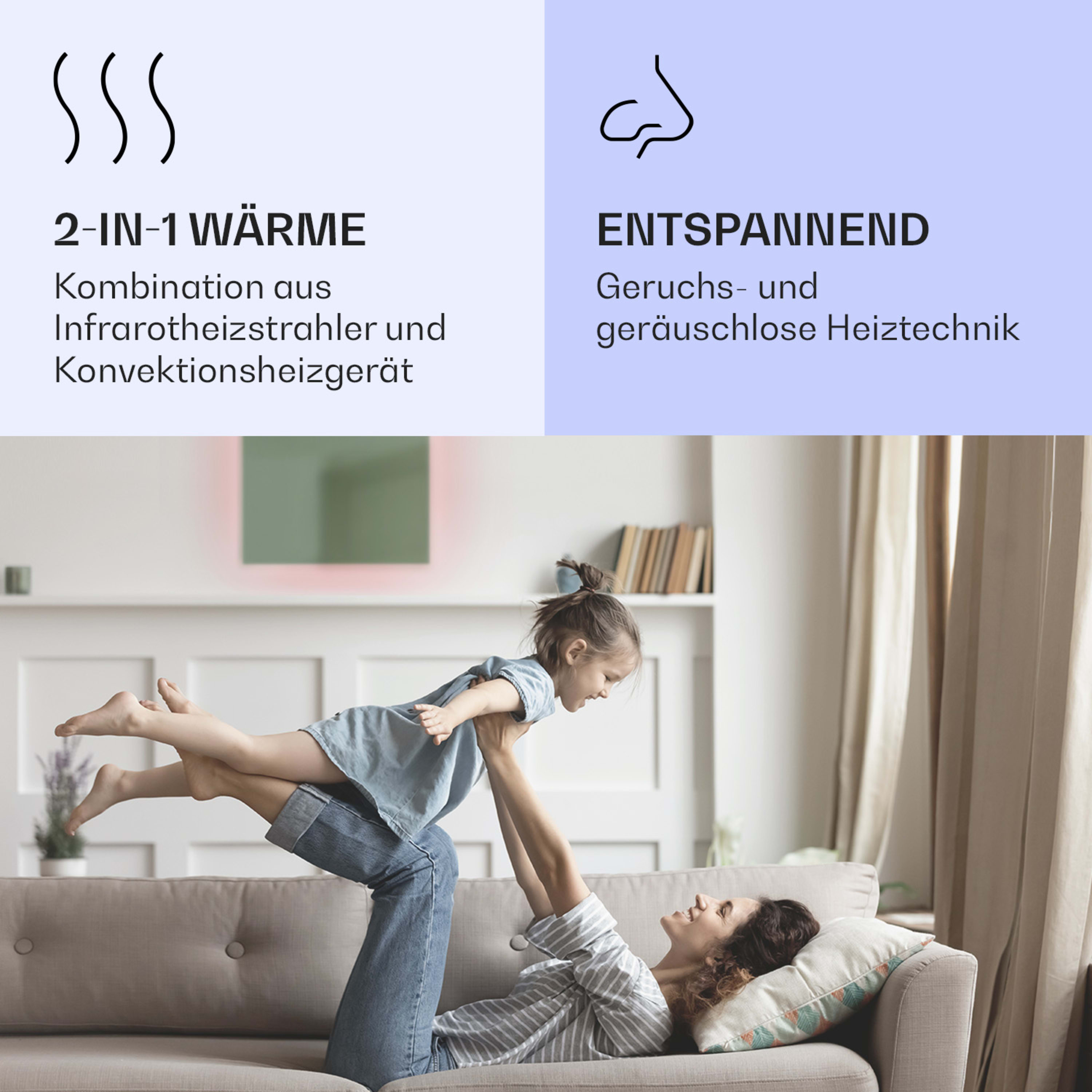 - Betriebsart: Wärmestrahlung (Infrarot-Heizstrahler) / Konvektion