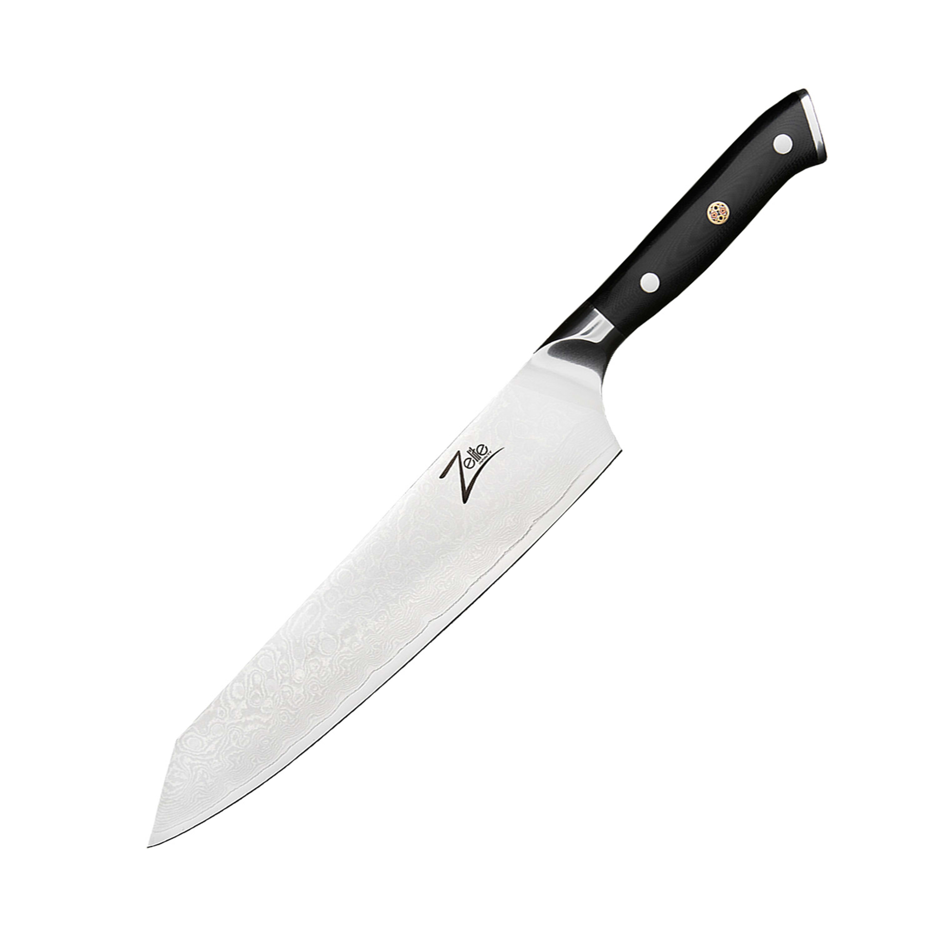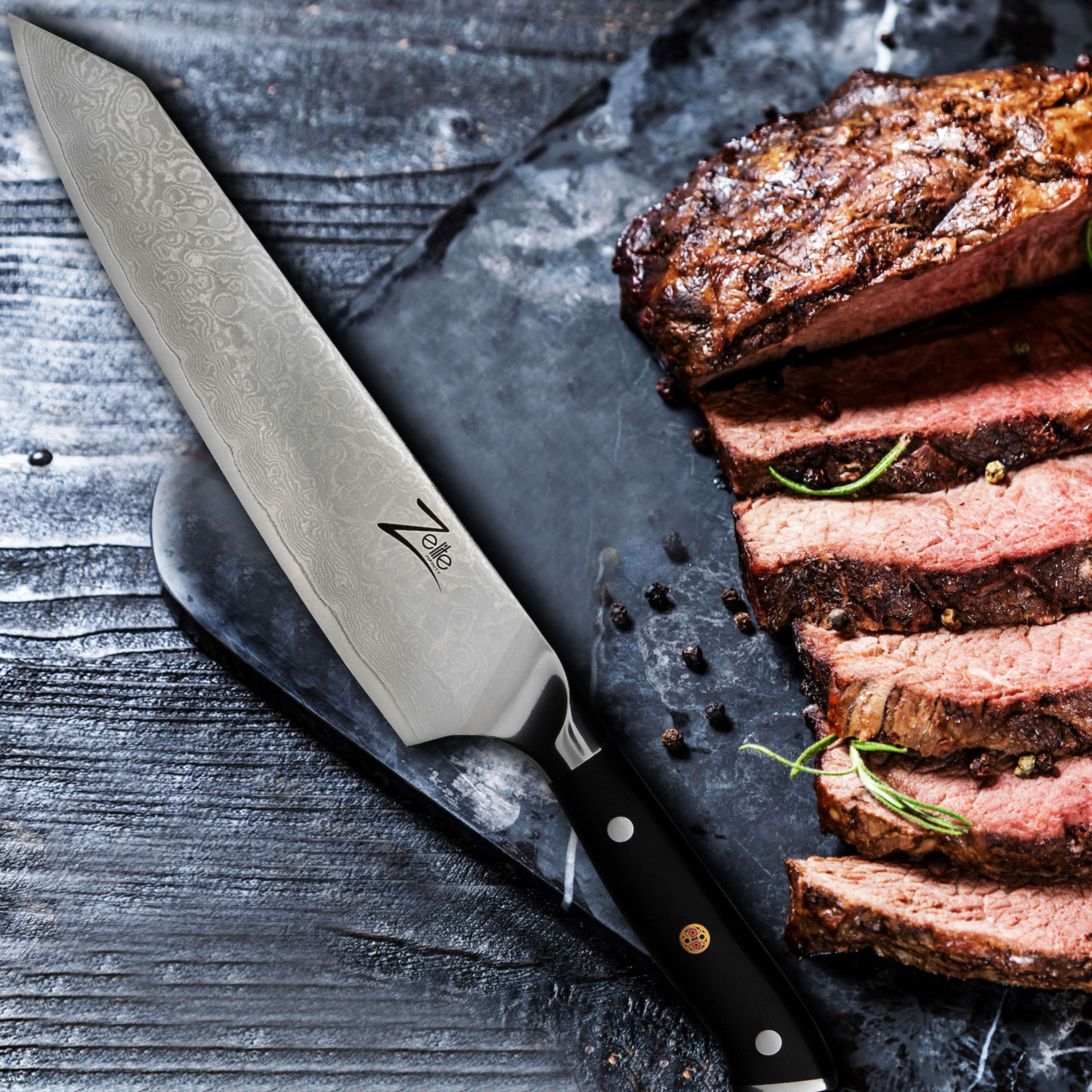 Damascus steel blade, need I say more? Okay, I will :) I've always admired chefs/cooks that can use longer, say 9 inch, knives, but though I have normal size hands I've always preferred a 6 inch chefs knife, for just about everything, and this one is excellent :) The finish on the Dalstrong is more impressive and it's edge near perfect but the Zelite's handle and, for the pinch grip, the bolster beats it for comfort, a close run though. You'll want a whetstone and guide, (get them at then same time to save on the postage !) as this is NOT a throw away when it gets dull knife, not one you'll just throw into the kitchen drawer when your done with it, you'll want to pamper this knife and show it off to your friends "It's sharp mind !" Well worth the price; Sabatier knives, which I've used since I could afford GOOD knives in the early 1980s are around the same price but no where nearly as good, though I managed to get nearly 20 years from them, I'm confidant these will last even longer, maybe the last knives I , or you, will ever have to buy, unless I drop it from a moving car ! A pleasure to use, and I do every day, if it went missing I'd buy it again in a heartbeat.