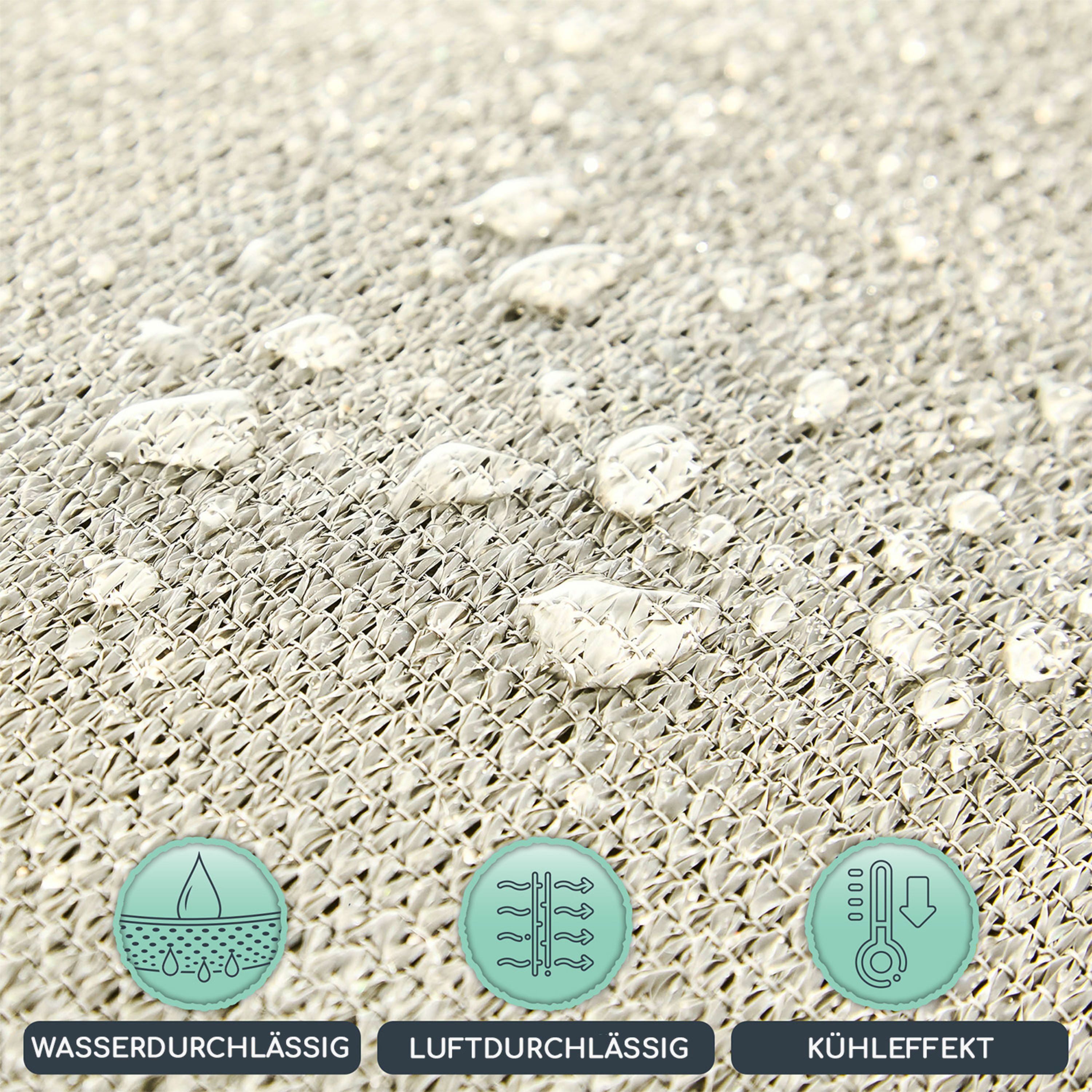 super robuste Verarbeitung Dieses Sonnensegel ist aus sehr robustem Material und sehr hochwertig verarbeitet. Die Ösen sind aus Edelstahl und können somit schon nicht rosten, was ein absoluter Plus-Punkt ist. Das umlaufend eingearbeitete Band hält die Ösen und sorgt somit dafür, dass diese nicht ausreißen können. Wir haben es bei uns über der Terrasse gespannt und es hat selbst den starken Sommerregen mit Sturmböen unbeschadet überstanden. Durch die HDPE-Geflechtstruktur ist das Segel innerhalb kürzester Zeit wieder getrocknet.