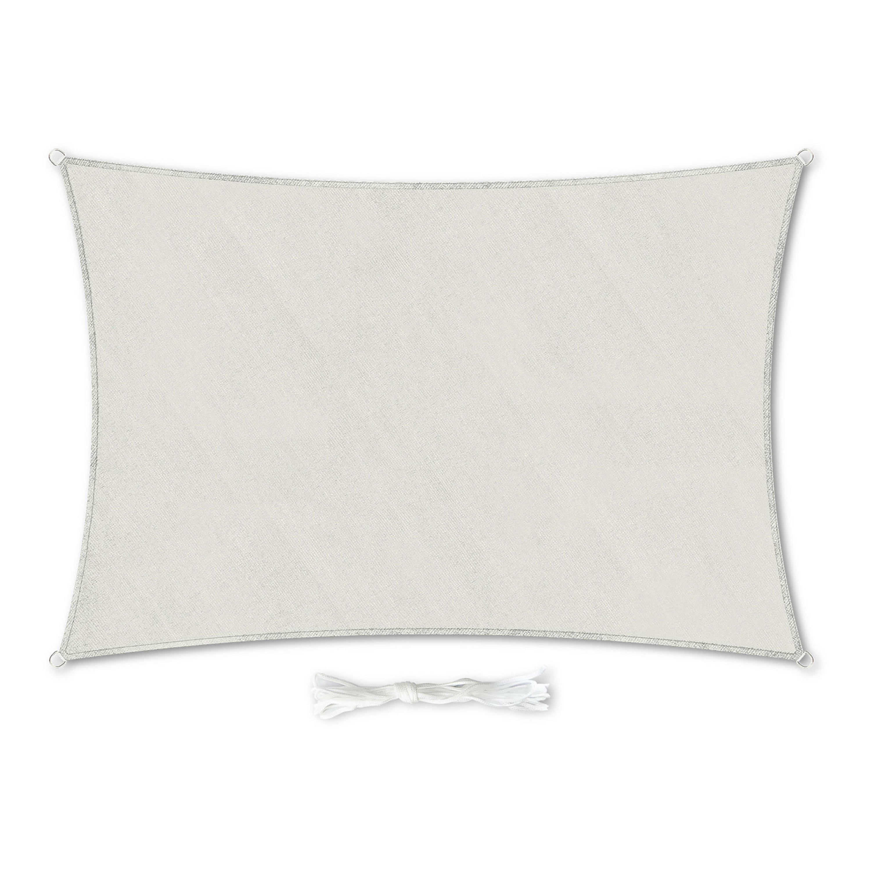 schönes Sonnensegel Das Segel kommt in einer schönen kleinen Tasche, in der es jederzeit wieder verstaut werden kann. Es besteht aus groben Webmaterial, welches die Sonnenstrahlen abschirmt, ohne alles komplett abzudunkeln. Wir benutzen es als Markiesenverlängerung, um unsere Terasse blickdicht zu machen. Klappt super.